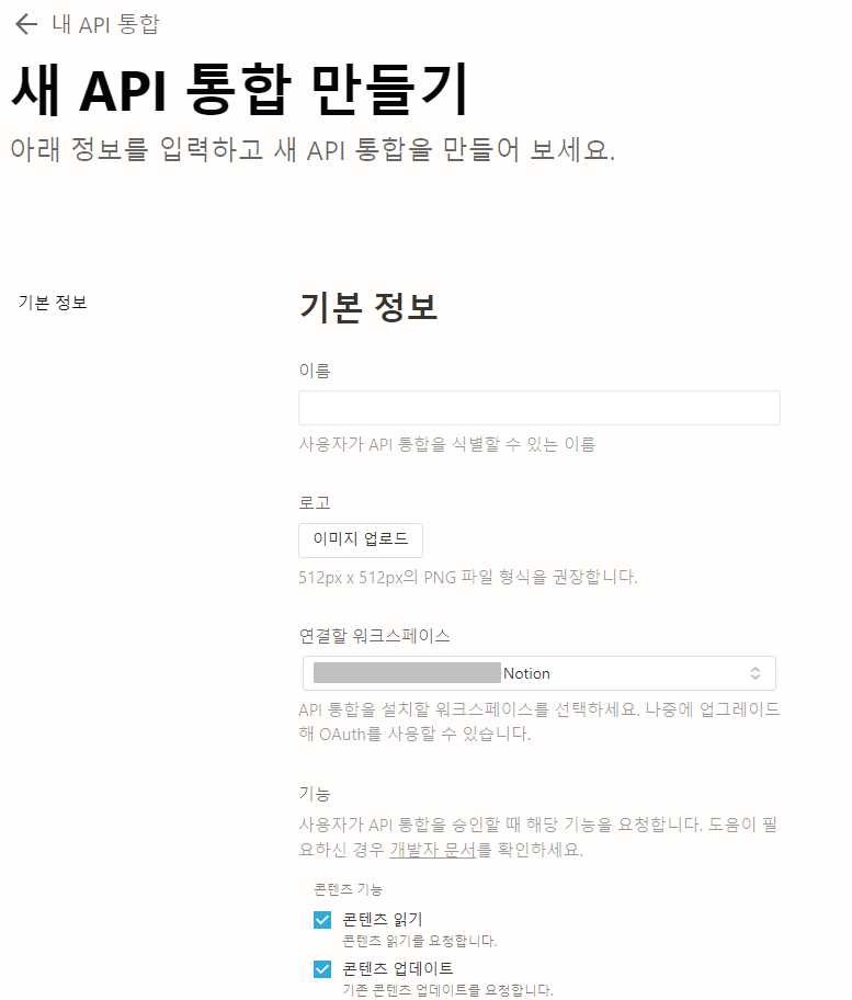 (통합 토큰은 생성 시 워크스페이스에서만 사용 가능합니다. 워크스페이스를 변경하려면 다른 API 통합 생성해야 합니다)