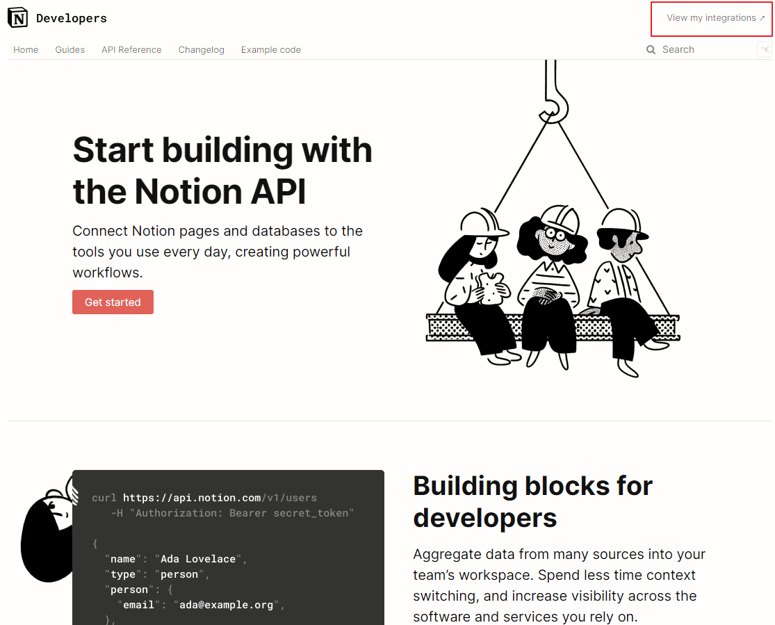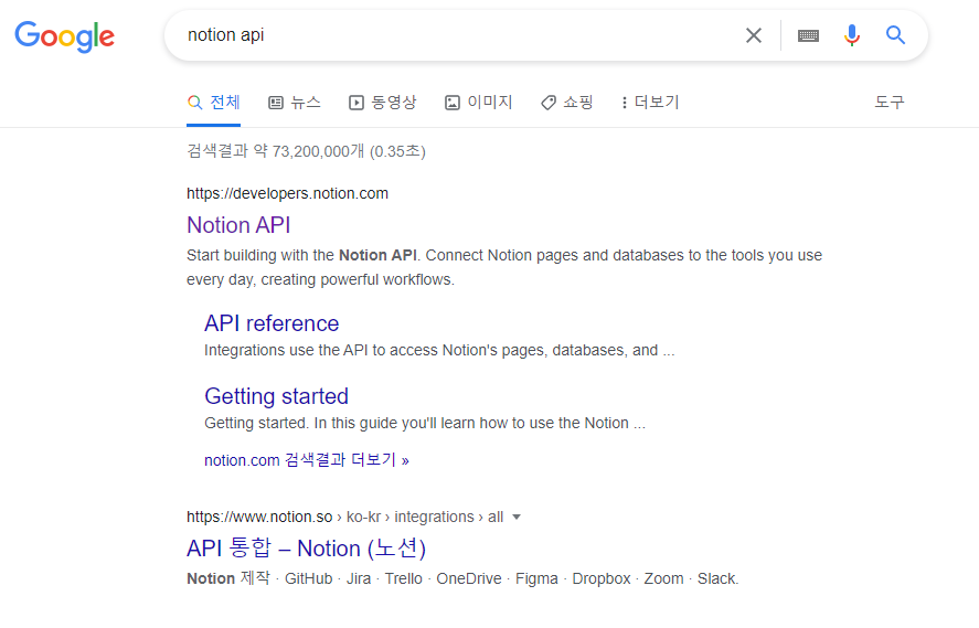구글에서 노션 API를 검색하면 아래의 이미지와 같이 "Notion API" 홈페이지가 보입니다