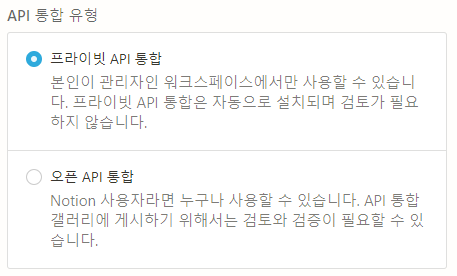 아래 API 통합 유형을 통해서 프라이빗, 오픈 둘 중 하나를 선택할 수 있습니다