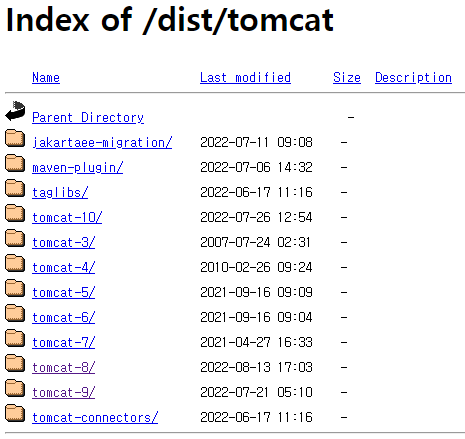톰캣 사이트에서 버전별로 설치 가능한 목록을 보여줍니다