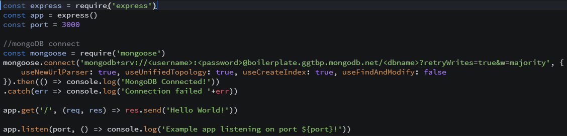 mongoose.connect('mongodb+srv://<username>:<password>@boilerplate.ggtbp.mongodb.net/<dbname>?retryWrites=true&w=majority', {