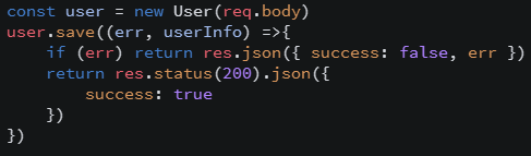 user.save() 함수를 실행하는데 몽고 dB에 데이터를 넘겨줍니다