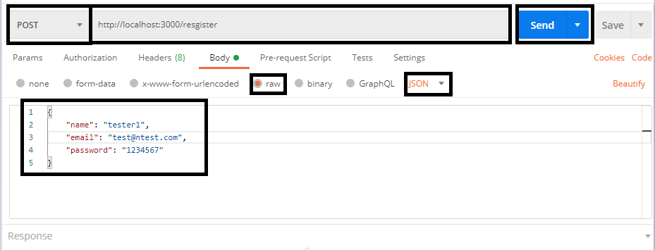 포스트맨을 실행하고 get에서 "post"로 변경하고 주소를 http://localhost:3000/register을 입력합니다