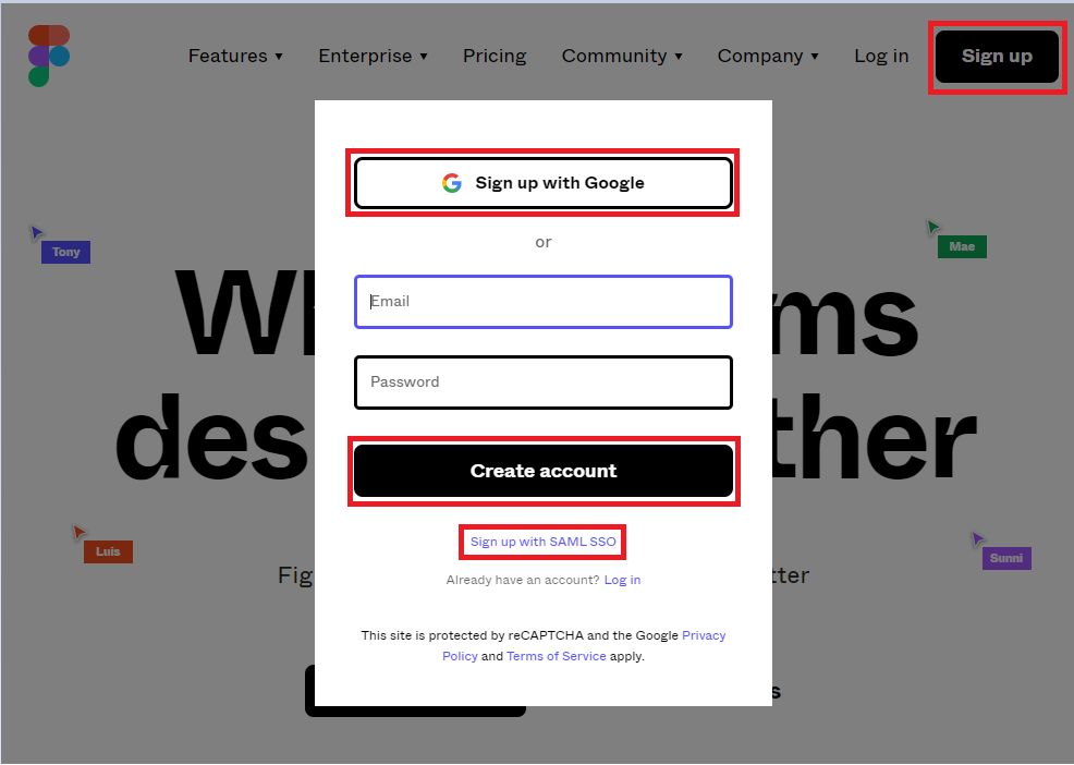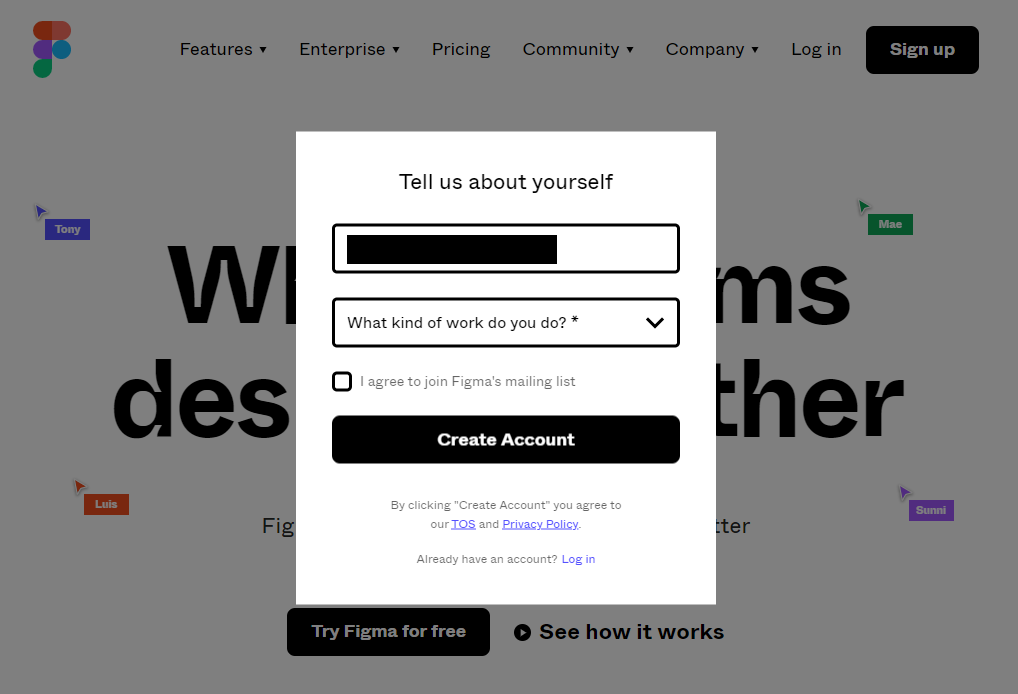 "I agree to join Figma's mailing list" 체크박스는 피그마 관련 메일 받을지 동의/미동의 체크박스입니다