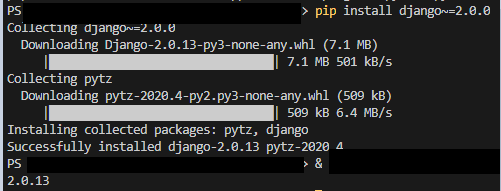Succesfully installed djang-2.0.13 메시지가 뜨면서 설치가 성공적으로