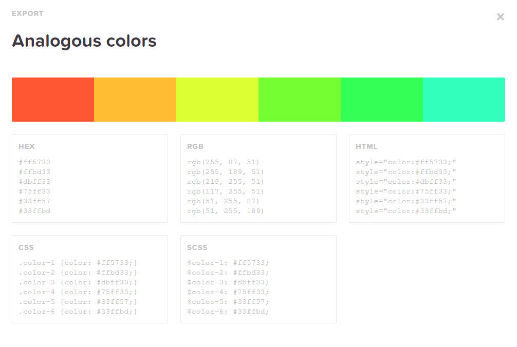 EXPORT COLORS를 클릭하면 팝업이 열리고 HEX, RGB, HTML, CSS, SCSS에서 사용하는 방법 등을 보여줍니다