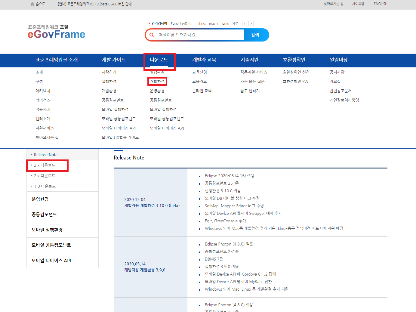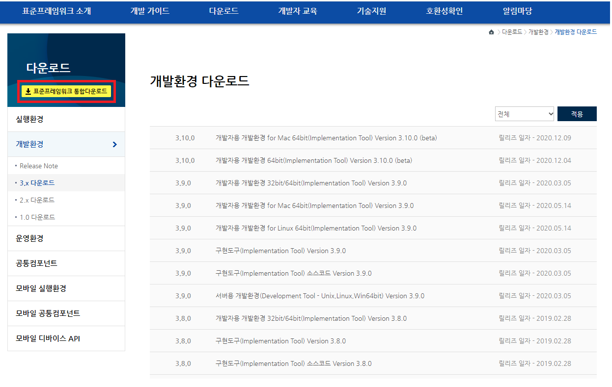 메뉴의 "다운로드"를 클릭하고 "개발환경"을 클릭합니다.