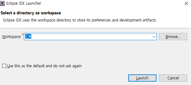 workspace 폴더에 기본적으로 맞춰져 있고 "Browe..." 버튼을 클릭해서 다른 경로로 변경도 가능합니다
