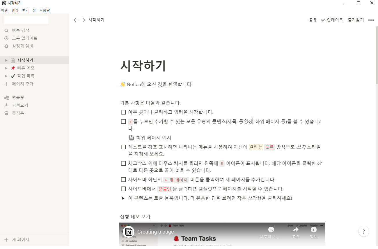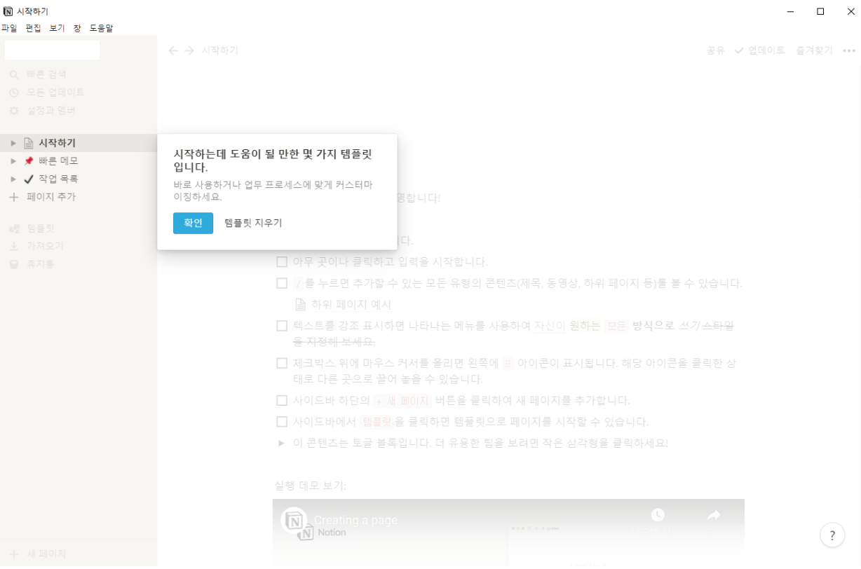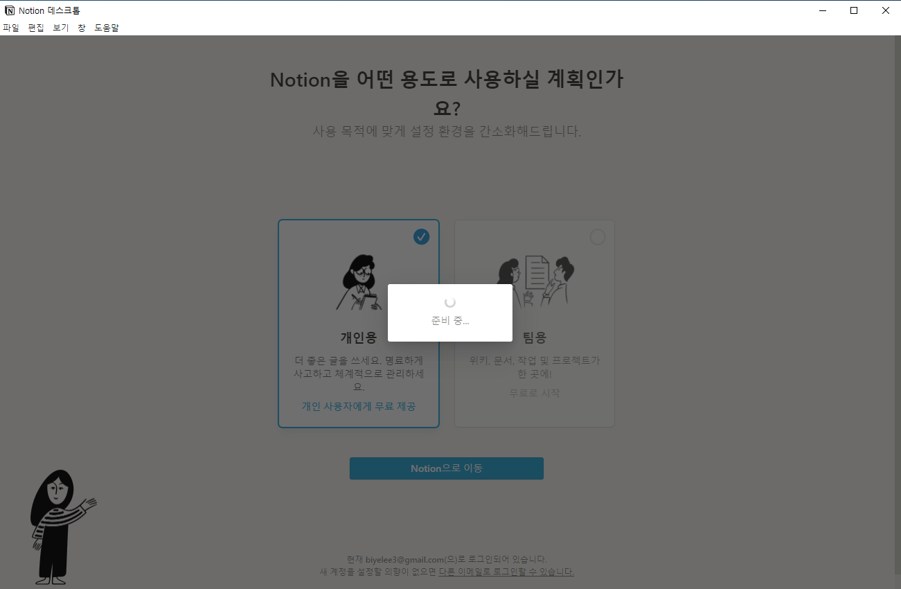 켜져 있는 노션 프로그램으로 포커스가 이동되고 로딩이 후 아래와 같은 창이 화면이 나옵니다