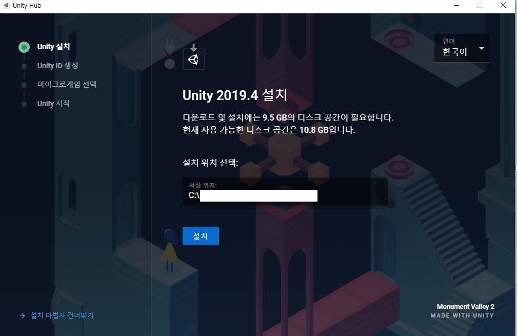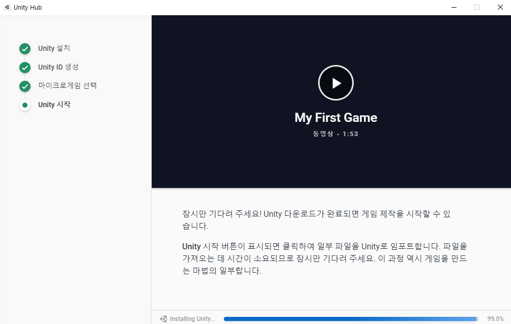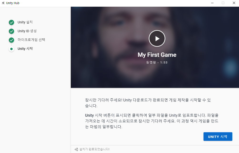 아래에 "설치가 완료되었습니다" 확인하고 UNITY 시작 클릭합니다