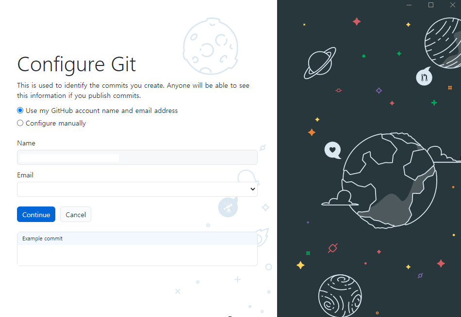 Configure Git 창이 나오고 Name, Email 정보가 나옵니다