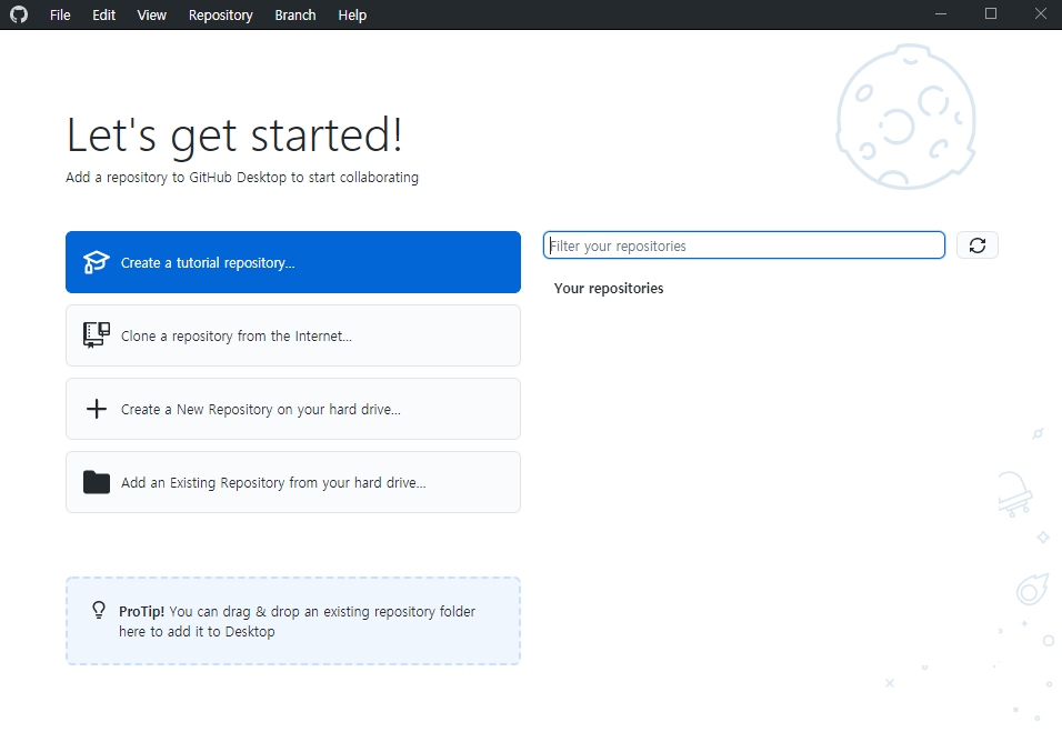 위와 같은 깃허브 데스크톱 창이 나옵니다