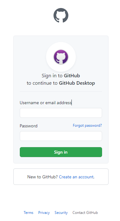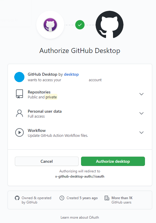 아래와 같이 화면이 변경되고 인터넷 브라우저 새 창이 열리면서 깃허브 로그인 화면이 열립니다