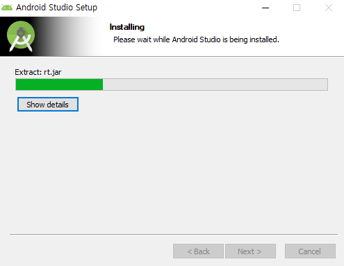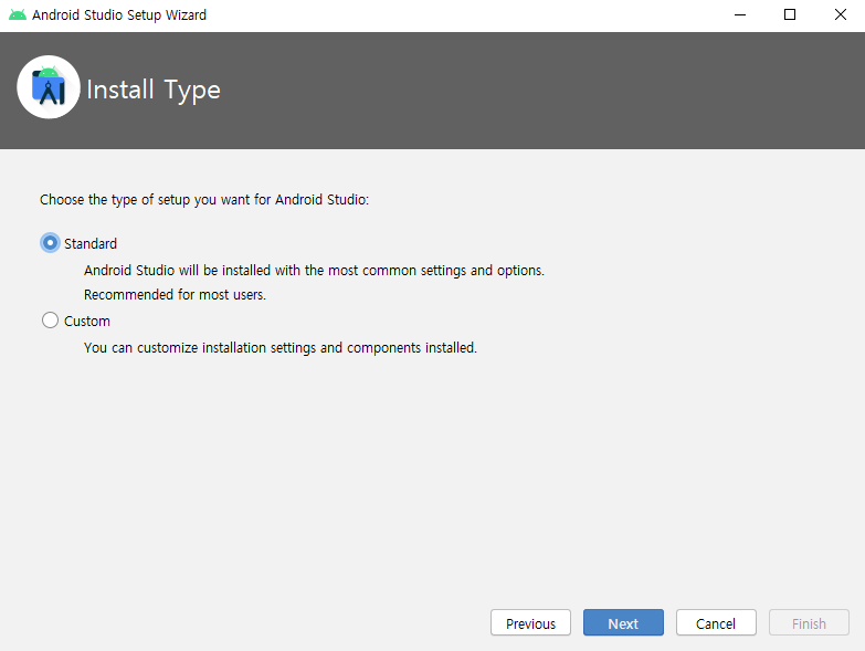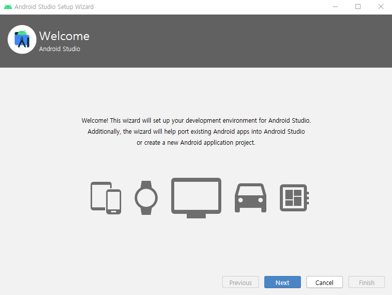 안드로이드 설정 여부를 묻는 것으로 전에 안드로이드 스튜디오 설정한 것이 있다면 위의 버튼을 클릭해서