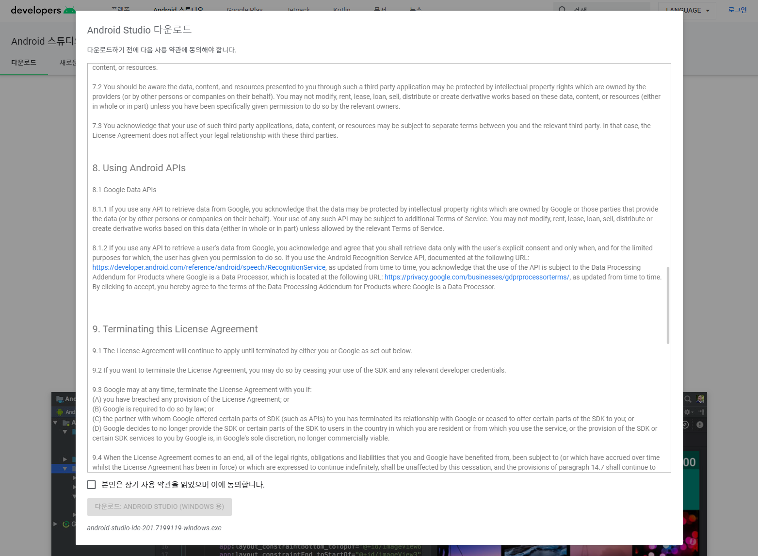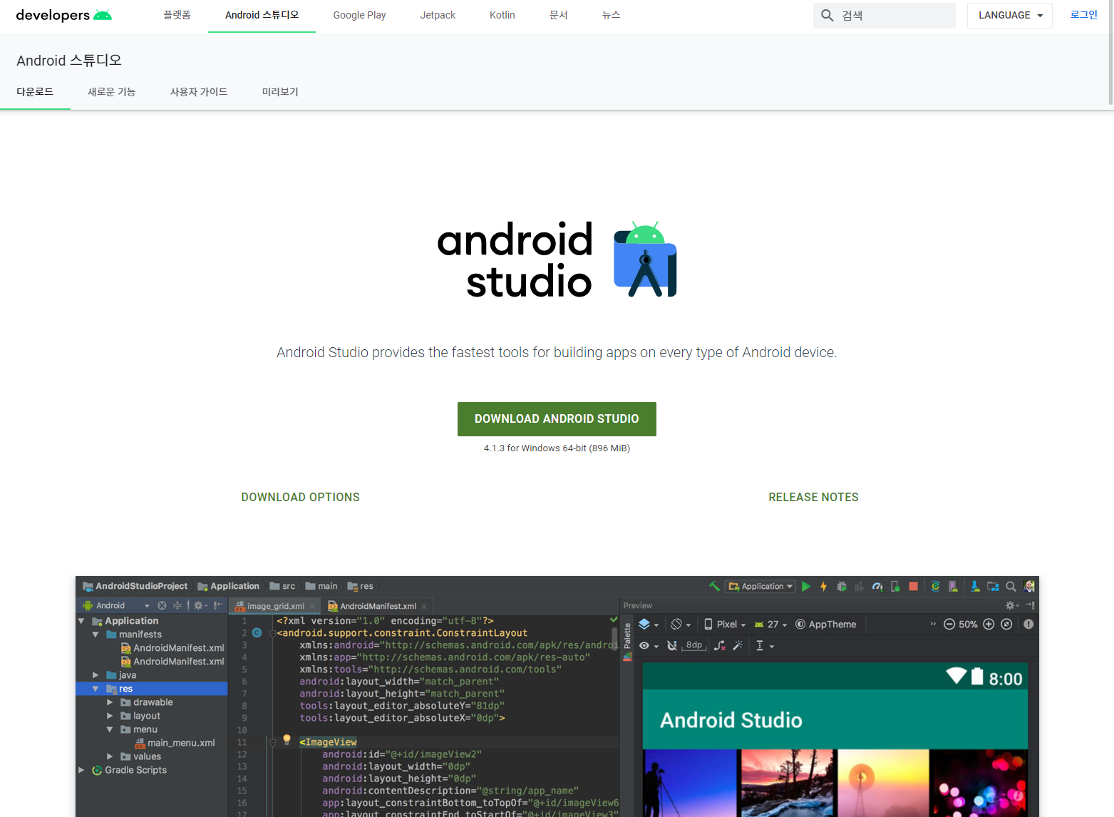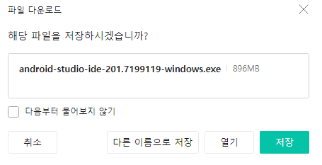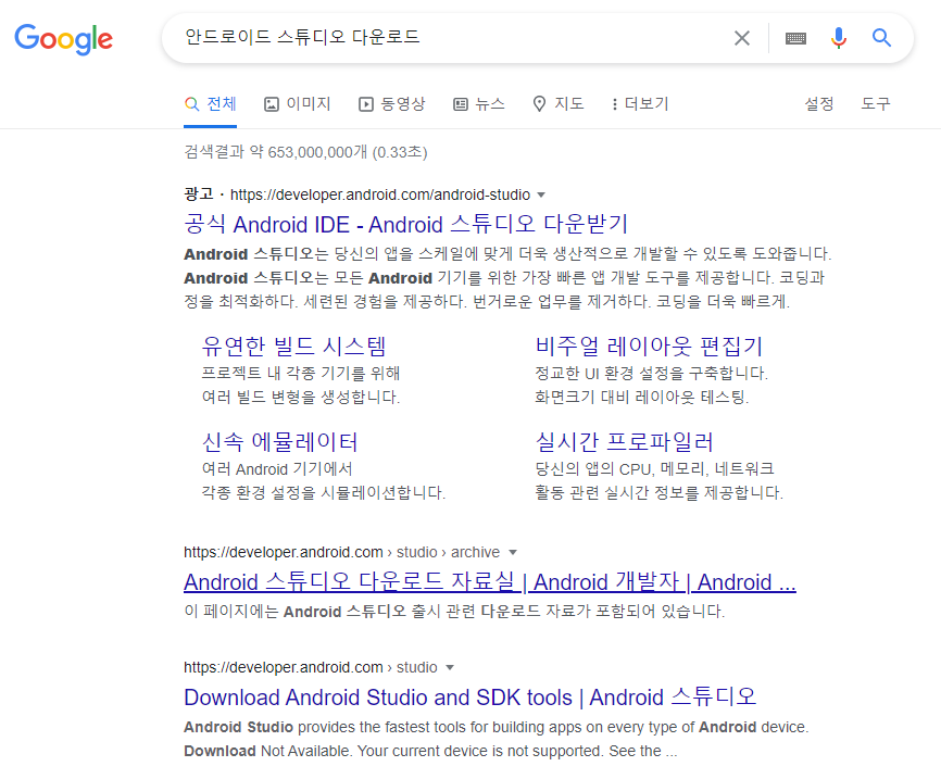 "안드로이드 스튜디오 다운로드"로 검색합니다
