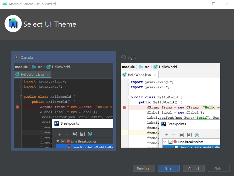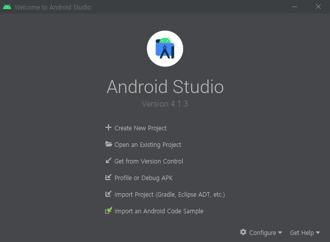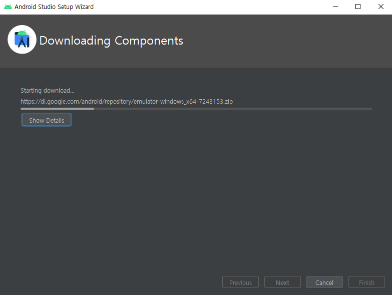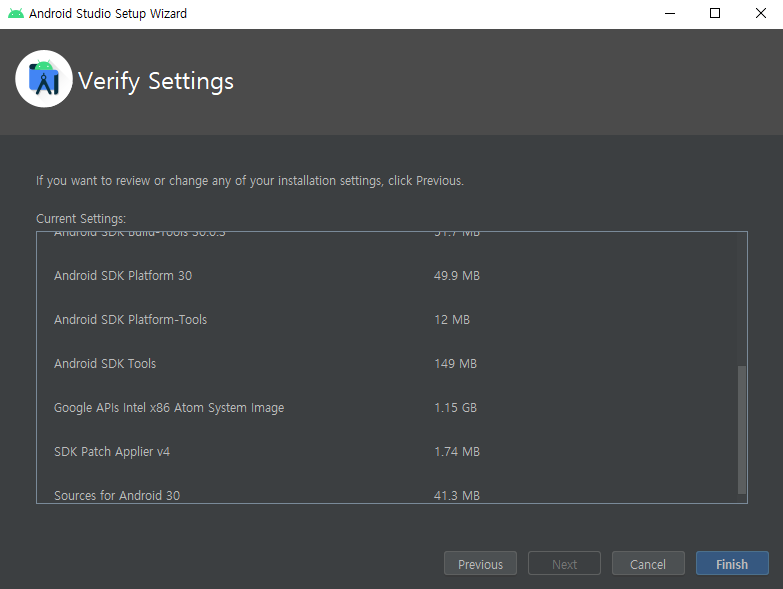 안드로이드 설정 여부를 묻는 것으로 전에 안드로이드 스튜디오 설정한 것이 있다면 위의 버튼을 클릭해서