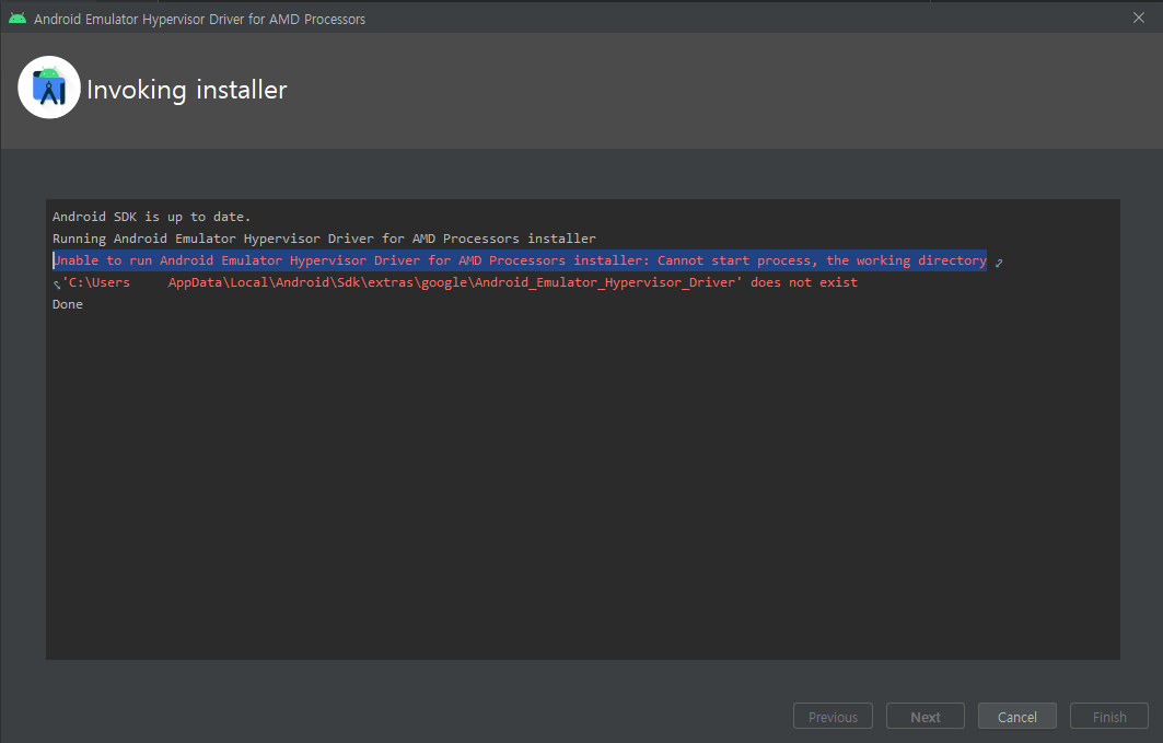 설치를 하고 에뮬레이터를 실행하면 에러가 발생하고 아래 에러 내역을 보여줍니다