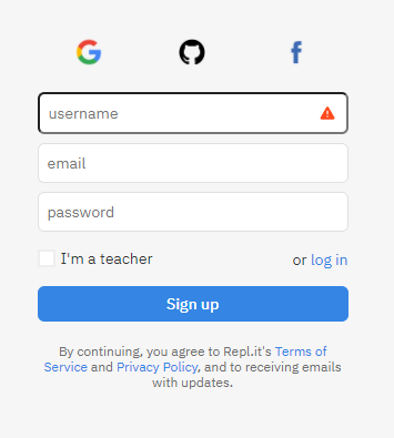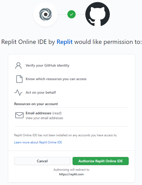 Authorize Replit Online IDE 버튼을 클릭하면 가입됩니다
