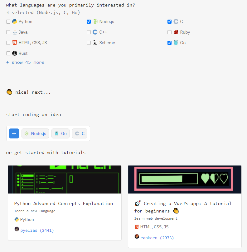 답변을 하면 위의 이미지 같이 바로 관심 있는 언어로 개발할지