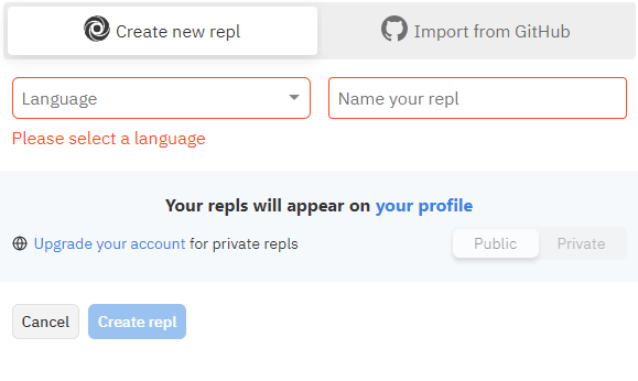 Create repl 버튼이 활성화됩니다 클릭합니다