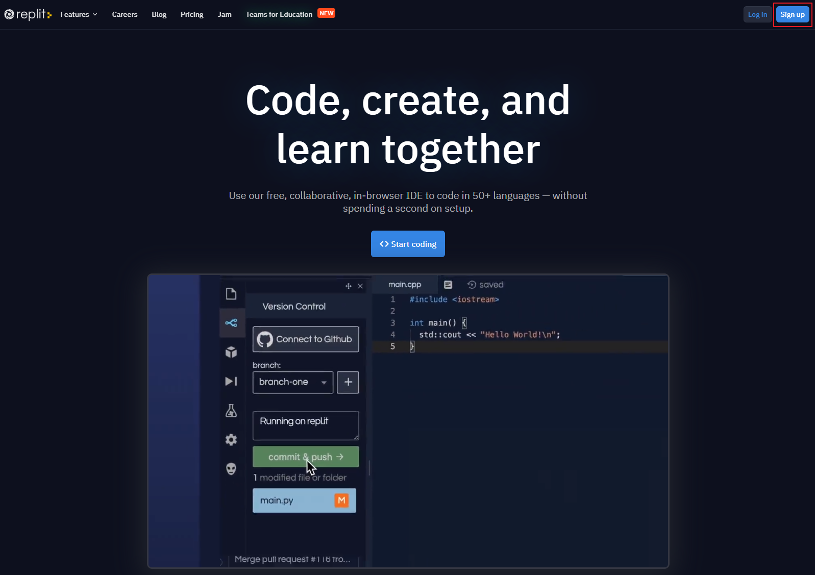Authorize Replit Online IDE 버튼을 클릭하면 가입됩니다