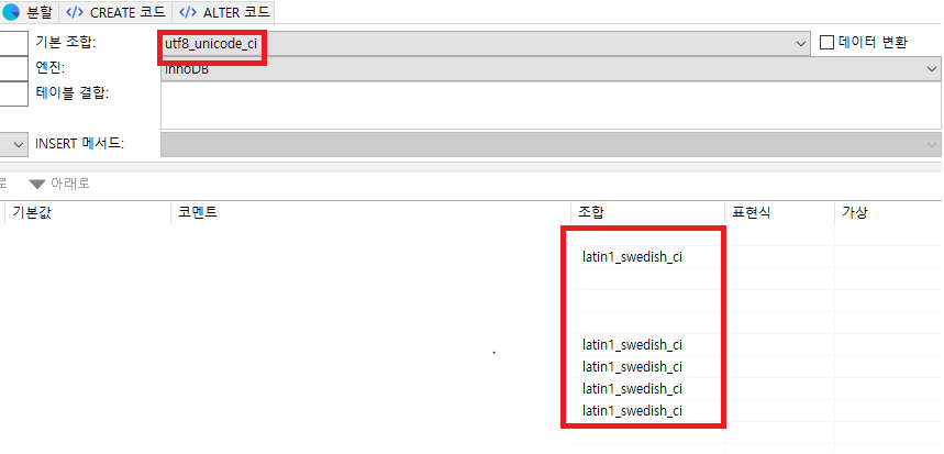그런데 각 컬럼의 기본 조합은 utf-8 아닙니다