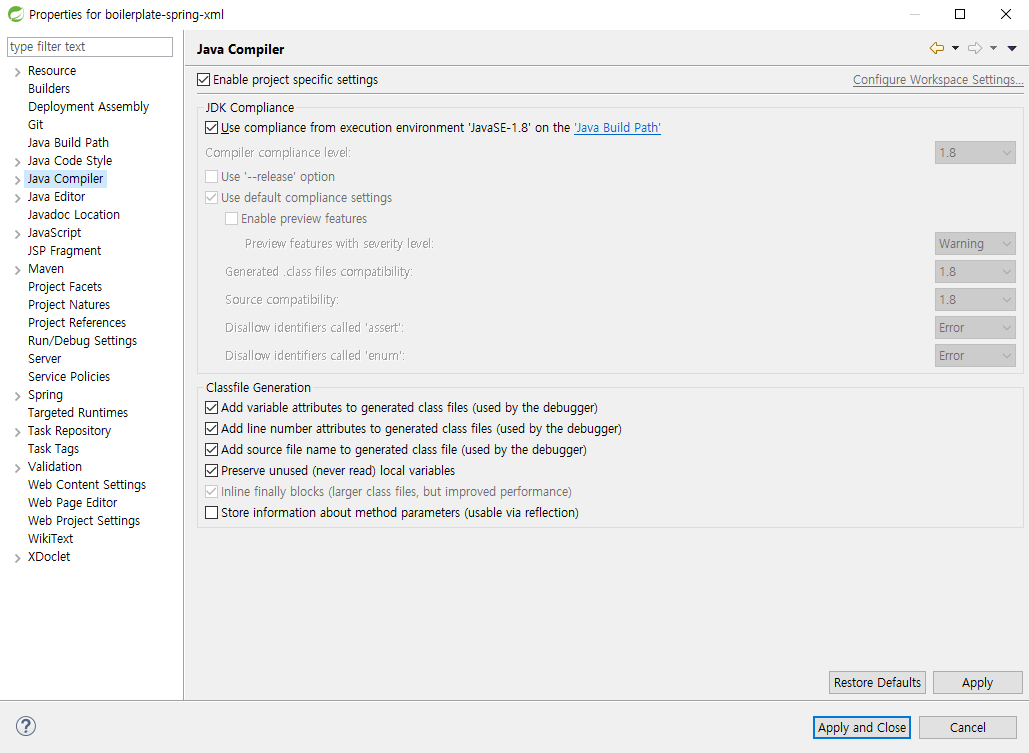 버전이 변경하는 버전과 맞지 않으면 JDK Compilance 바로 아래에 있는 체크박스를 클릭하면오른쪽 셀렉트 박스가 활성화되고 버전을 변경할 수 있게 됩니다메이븐에 명시된 자바 버전도 변경합니다java-version 1.6을 아래와 같이 1.8 변경합니다