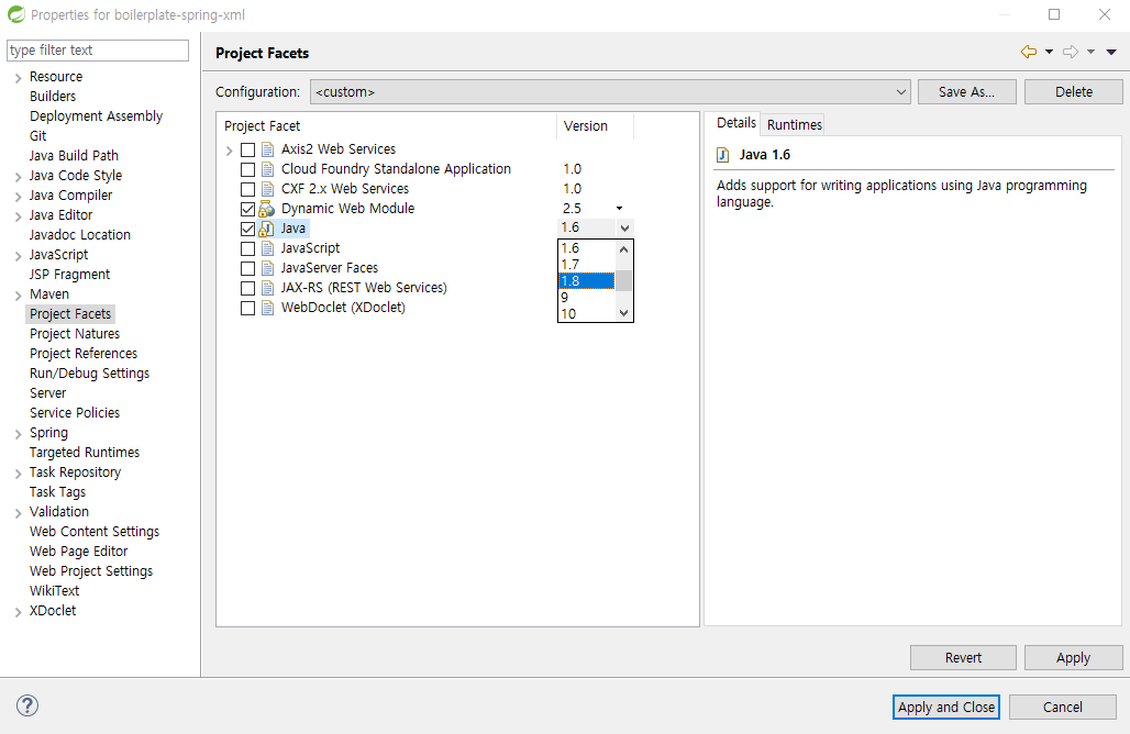 Project Facets 클릭하고 Java 1.6 버전을 1.8로 변경합니다