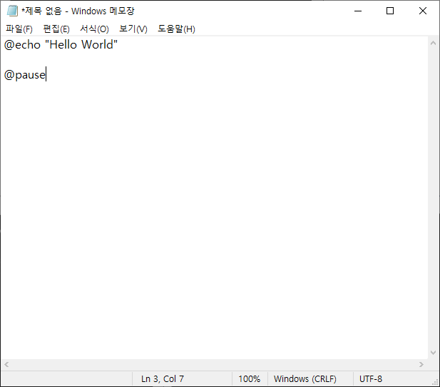 echo "Hello World" 입력하고 확장자를. bat으로 저장합니다