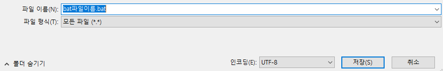 파일(F) > 다른 이름으로 저장(A) > "파일이름.bat" 입력, 파일 형식은 "모든 파일(*.*)" 지정 > 저장(S)