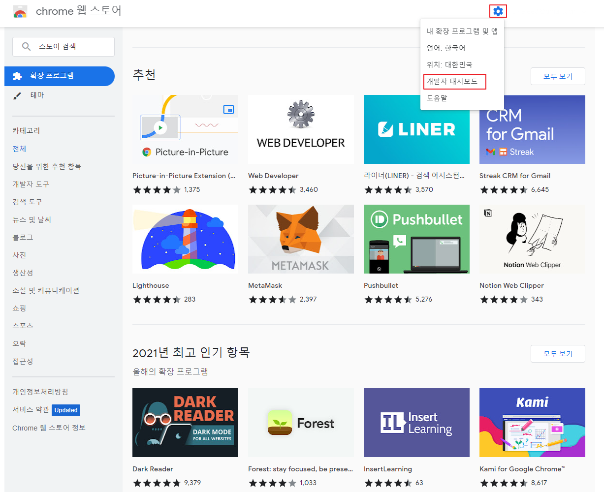 로그인을 한 상태로 웹 스토어 이동 혹은 웹 스토어에서 로그인을 화면 아래와 같이 화면의 맨 위의 톱니바퀴 모양을