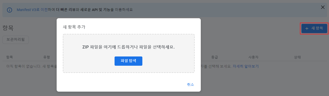 확장 프로그램 등록은 + 새 항목 클릭하면 새 항목 추가 창이 나옵니다