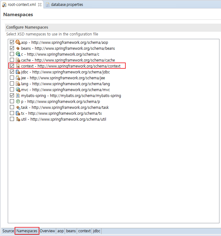 탭에 열려있는 root-context.xml 클릭 후 아래의 탭 중 Namespace탭을 클릭합니다