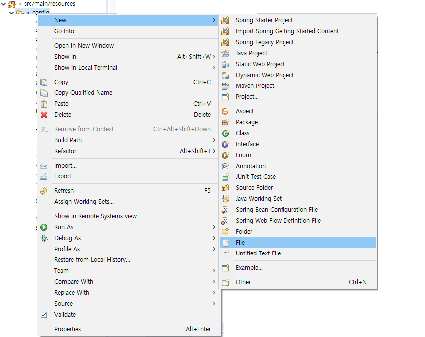 config 폴더 우클릭 후 New 선택 후 File을 클릭합니다