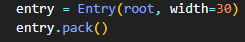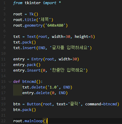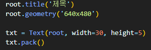 그리고 버튼, 레이블처럼 화면에 보이게 하기 위해서 pack()를 사용합니다