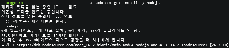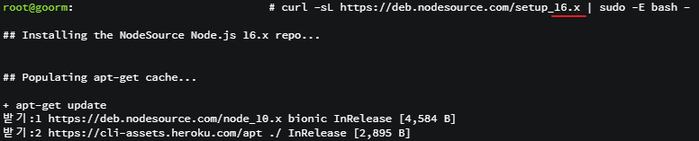 명령어 : 1. curl -sL https://deb.nodesource.com/setup_16.x | sudo -E bash -
